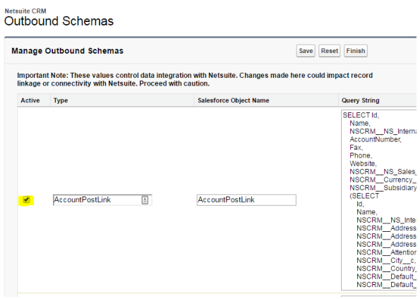 Outbound Schemas are SOQL queries, which define the fields that are sent from Salesforce to NetSuite.