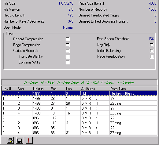 Clicking on the File Statistics icon displays a dialog box listing the currently-open file’s statistics. You can print these statistics to a text file or save them to a description file usable by