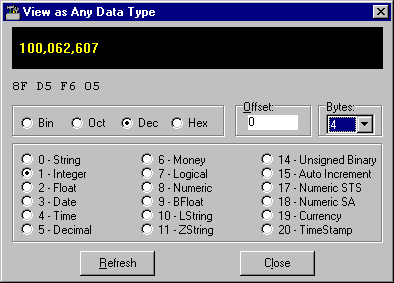 When a file is open, you can right-click on any position in the buffer and select Show As. A dialog box appears in which you can view the bytes at the chosen buffer position as any data type.