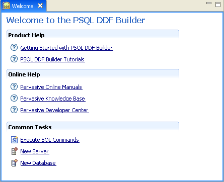 1DDF Builder and PCC share common components. Because of this, some editors, views, and wizards are documented in other Pervasive PSQL books and not in DDF Builder User’s Guide.