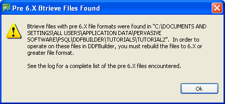 In this lesson, you have Btrieve files with an existing set of table definitions. Btrieve files in a pre v6.x format are no longer compatible with the version of Pervasive PSQL supported in this release of DDF Builder.