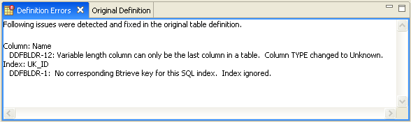Click OK to clear the message and display the table definition.