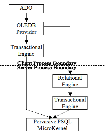 The Pervasive OLE DB Provider uses an architecture similar to that of the ODBC and JDBC drivers to communicate to the remote server. By using the relational engine on the server-side, you should see increased performance in most SQL-based use of the provider, including stored procedures and complex queries.