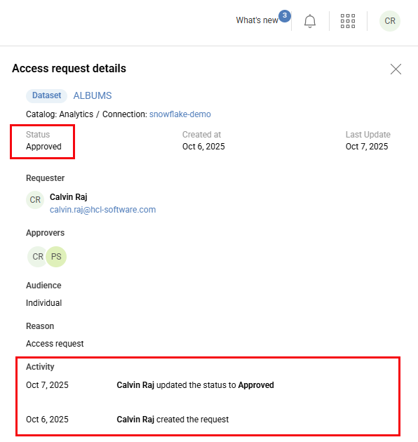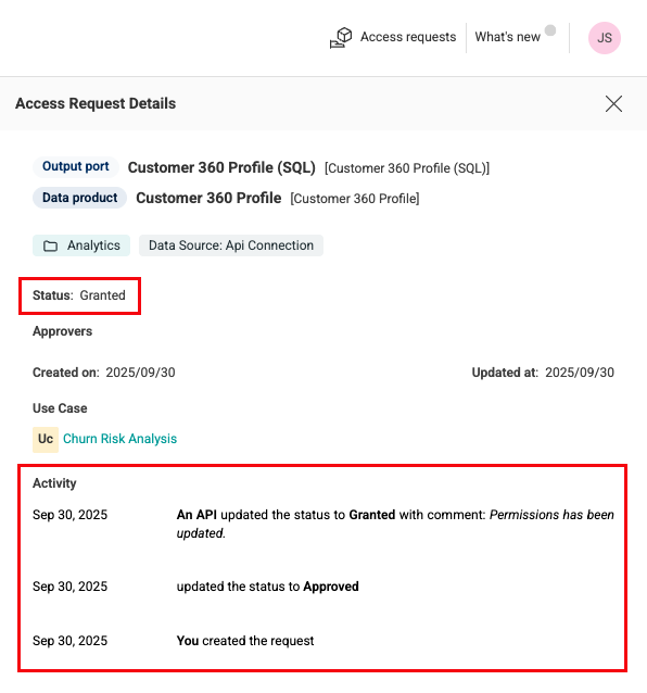 In Studio, the data owner can view the current status and all status change activities of an access request.