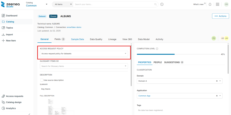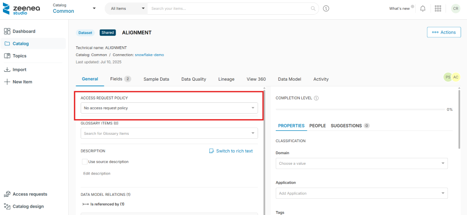 Access requests in Zeenea are managed through policies defined by administrators in the Zeenea Administration interface. These policies specify rules for requesting access to data assets, including required attributes. Data owners can define and manage access request policies in the Policies section. After a policy is created, it can be associated with individual data assets. Only items linked to a policy support access requests. Data consumers can request access to a data asset only if an access request policy is associated with it.
