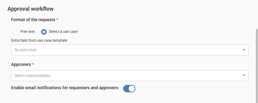 Enable email notifications for requesters and approvers: Use the toggle to manage email notifications.