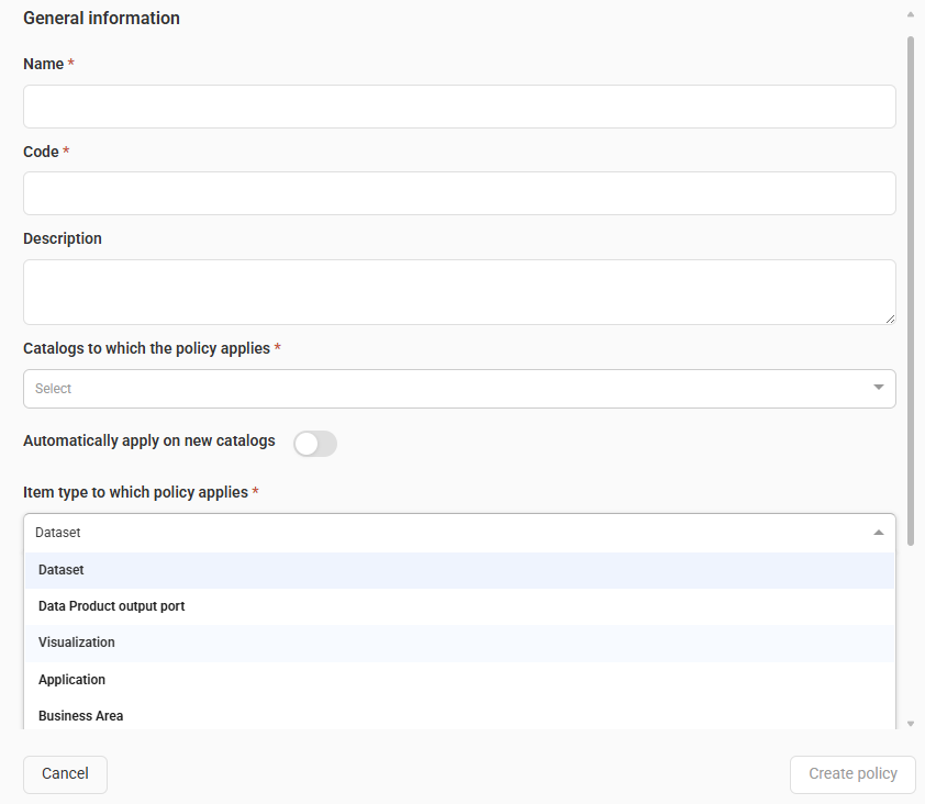 Automatically apply on new catalogs: Toggle to automatically apply the policy to new catalogs.