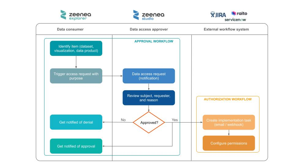Approval workflow: Requests are automatically routed to the appropriate data owner or administrator for review and approval in Zeenea Studio, ensuring security and compliance are upheld.
