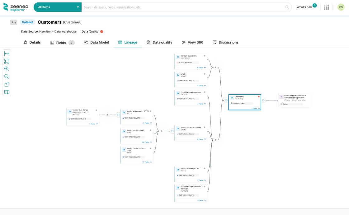 Lineage is presented as a graphical component in the Studio and Explorer for Items of type Dataset, Visualization, or Data Process.