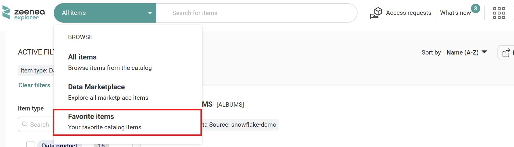Click the search bar dropdown in Zeenea Explorer.