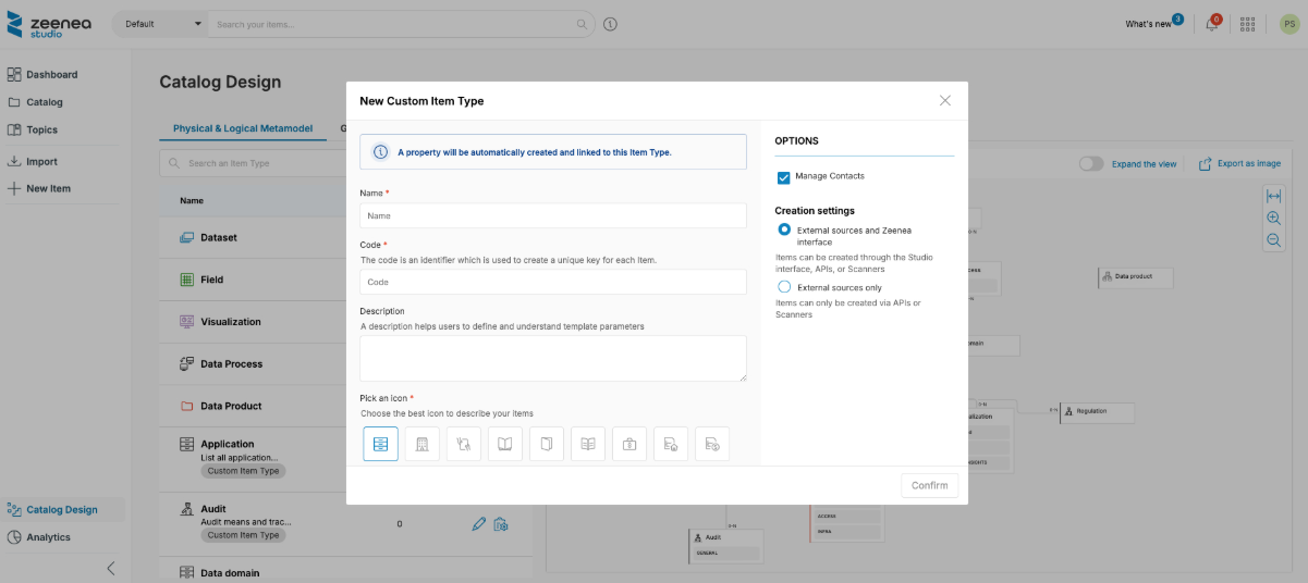 In addition to the native item types supported by the catalog, Zeenea allows you to configure custom item types to categorize, contextualize, and enrich the documentation of your data assets.