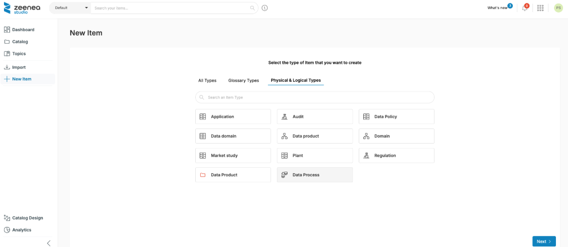 Search for Datasets (already imported in the catalog) or for Custom Items to link them to the Data Process.