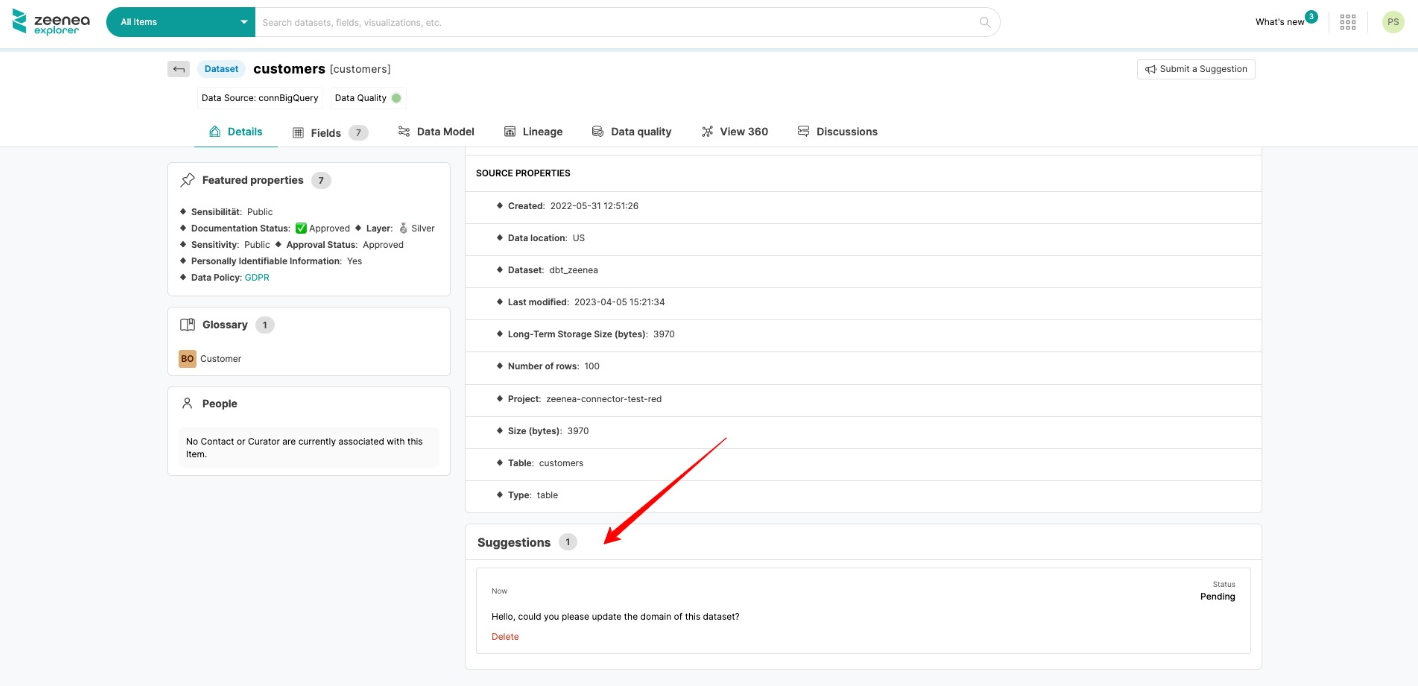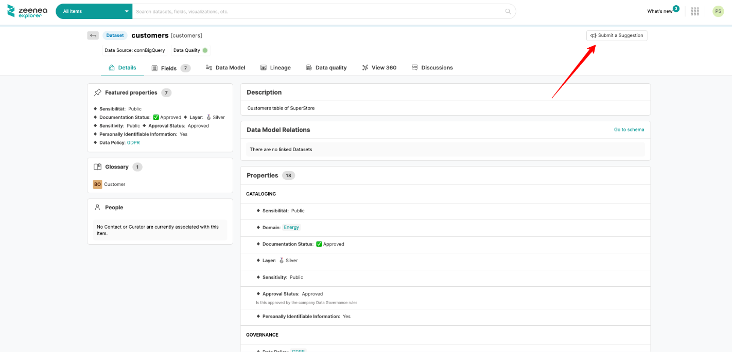 In the Explorer, from the details page of an Item or from its overview panel, you can submit a suggestion to improve or enrich the documentation of this Item in Zeenea, or to report an error or a quality issue concerning this documentation.