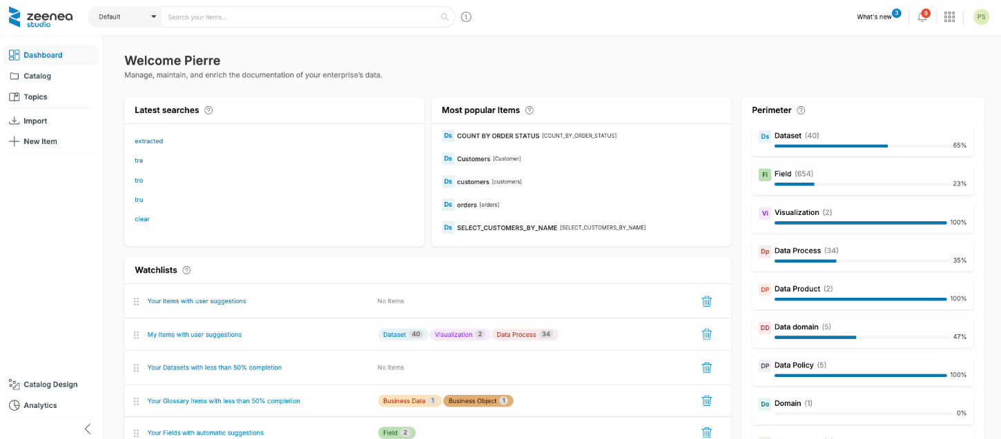 The dashboard is the home page of the Data Steward's Zeenea Studio application.
