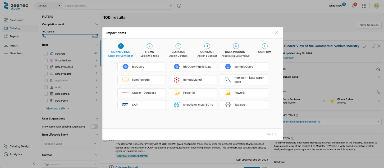 For more details on importing items into the catalog, read Importing "Datasets" or "Visualization" items into Zeenea