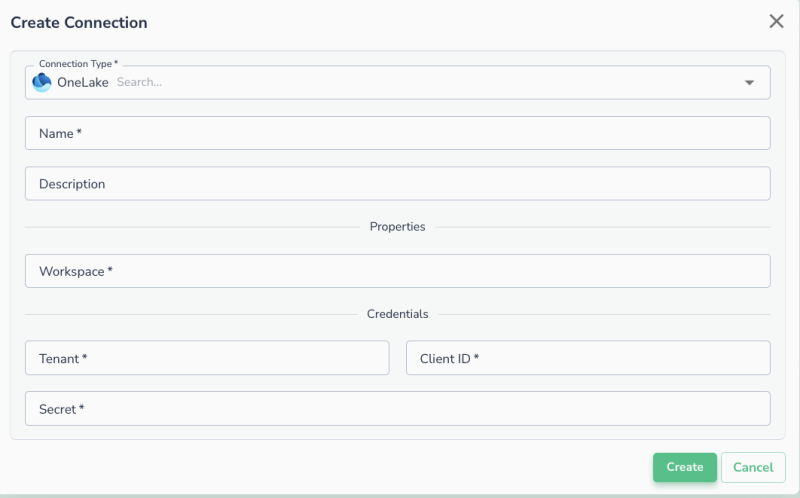 OneLake using Client ID and Secret. Follow the steps below to set up the connection.