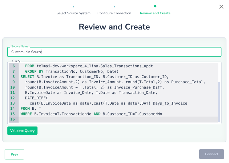 Instead of connecting to an existing table or view, you can define a data source using an SQL query. This is useful for applying transformations or joining multiple tables to monitor the output.