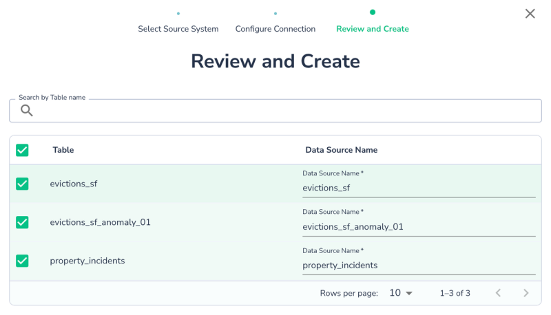 Choose tables/views from the same schema/dataset/collection. You can rename the Actian Data Observability data source names if desired. Click