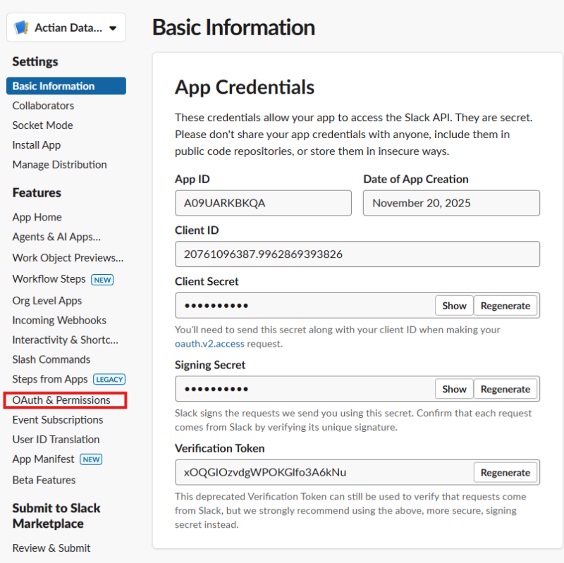 Bot User OAuth Access Token for use in the Actian Data Observability channel).