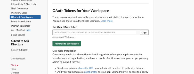 Scroll to the top of the OAuth & Permissions page and click Install App to Workspace.