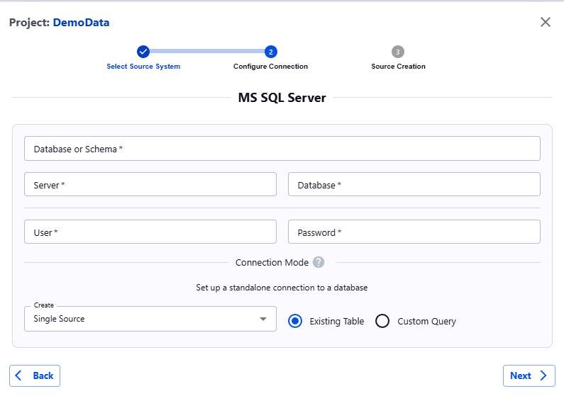 To connect to SQL Server, chose it's icon from the list of available connections which will open the following dialog
