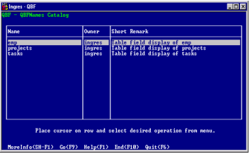 The QBFNames Catalog frame, shown here, contains a list of the QBFNames that you can access. A QBFName represents a data display form designed or customized with the VIFRED and then linked to a JoinDef or table. For a discussion of QBFNames, see the chapter “Using VIFRED.”