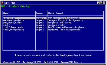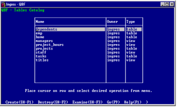 Each type of query target—QBFName, JoinDef, and table—has its own Catalog frame. Each Catalog frame offers various operations, such as create, destroy, edit, or examine, that are specific to that type of query target. The Tables Catalog frame operations are discussed in detail in the chapter “Using the Tables Utility.” Operations on the JoinDefs and QBFNames Catalog frames are discussed in the chapters “Using JoinDefs in QBF” and “Using VIFRED.”