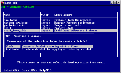 1. Choose JoinDefs from either the Ingres Menu or from the QBF Startup frame.