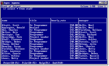 The resulting data displays in the output window for the Interactive Terminal Monitor frame, as shown in the following figure. In this example, all rows from the Staff table in the current database have been retrieved, but not all of the data can fit in the window at the same time.