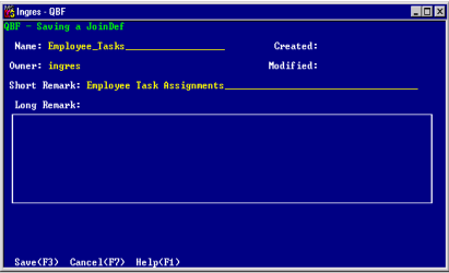 The JoinDef Save frame allows you to enter a short remark or description of the JoinDef and also a longer remark or description. These remarks are useful for keeping track of your JoinDefs. The Short Remark that you enter here appears on the JoinDefs Catalog frame to the right of the JoinDef's name and owner. The Long Remark that you enter here appears whenever a user chooses MoreInfo about a JoinDef.