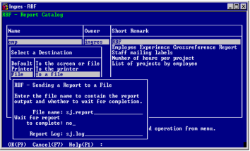 If you send the report directly to a file, RBF displays the Sending a Report to a File pop-up.