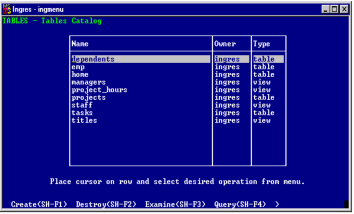 The Tables Catalog frame lists the tables, views, and indexes in the database to which you have access. It also lists the synonyms that you or the DBA own.