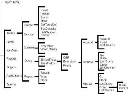 The Tables Utility lets you create or destroy tables in a database and examine their structure. It also provides access to Ingres forms‑based tools that allow you to run queries and reports on data contained in the tables. You can perform the same operations offered in the Tables Utility by using database query language commands, which are discussed in your query language reference guide.