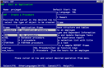 Creating a procedure is similar to creating a frame. Select Procedure from the Create a Frame or Procedure pop-up frame of the Edit an Application frame. You see a menu of the types of procedures, as in the following figure: