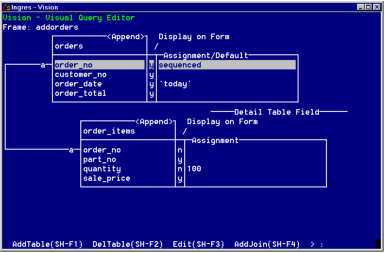 For example, you can have an Append frame on which users add new orders. You can specify the order number column as a sequenced field on the form. Vision automatically generates a unique, sequential number for each new order.