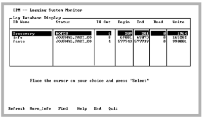 The screen contains an entry for each active database. Information includes the number of transaction begins and ends, and the number of log file write requests. The status of a database can also be determined. For a list of valid status values, see