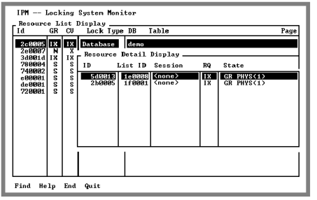 The Resource Detail Display screen pops up when you select the Examine menu item from the Resource List Display screen. This screen displays all the locks held on the specified resource.