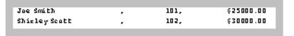 Copy data from the "employee" table into a file. The example copies employee names, employee numbers, and salaries into a file, inserting commas and newline characters so that the file can be printed or edited. All items are stored as character data. The "sal" column is converted from its table format (money) to ASCII characters in the data file.