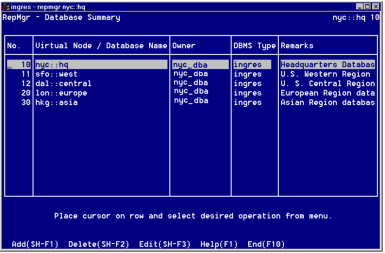 The Database Summary windows lists the databases that Ingres Replicator recognizes. By default, the local database information that you entered in the Define Local Database window appears in the list.