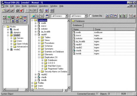 After installing replication objects, sub-branches appear under the Replication object category branch in the Database Object Manager (DOM), as shown in the following example. (Your release of Ingres Replicator appears on the Replication object category branch when it is expanded.)