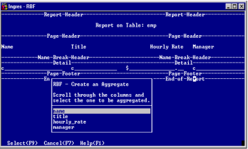 3. Position the cursor on the column for which you want the aggregate, and choose the Select operation.
