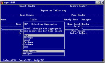 4. Place the cursor on the desired aggregate function and choose the Select operation.