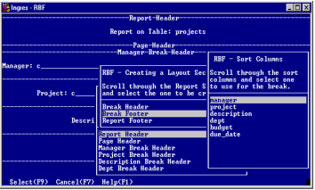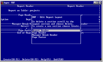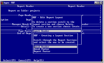 3. Place the cursor on the name of the report section that you want to create and choose the Select operation.