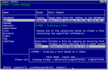 If you based the form on a table or JoinDef, VIFRED displays a default form, with one field on the form for every data column in the table or JoinDef. The titles, internal names, and data display formats of these fields are based on the underlying data columns. For special issues regarding the long varchar, byte, byte varying, and long byte data types and delimited identifiers, see the note following this procedure.