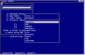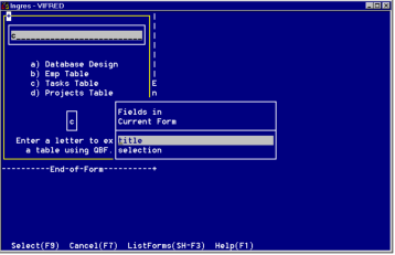 If the current form has fields, VIFRED displays a pop-up containing a list of the fields. If the current form does not have fields, VIFRED displays a list of the forms to which you have access.