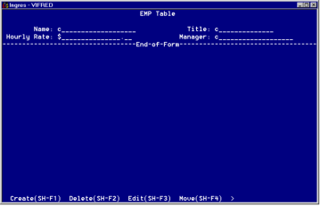 After you create a form with the Create operation on the VIFRED Forms Catalog frame, VIFRED places you on the VIFRED Form Layout frame. You can also access the Form Layout frame by placing the cursor on the name of a form listed in the VIFRED Forms Catalog frame and choosing the Edit operation.