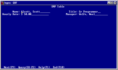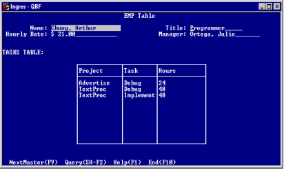 Regardless of the format, use the NextMaster operation to go from one master record to the next. Within each master you can view all associated detail records. If the display includes a table field for the detail records, QBF loads all detail records for a single master into the table field. If all the rows do not fit in your window, you can scroll through them. QBF displays an Out of Data message if you attempt to scroll past the end of the table field. You can suppress this message by changing the setting of the II_SCROLL_MSG environment variable/logical. For details, see the System Administrator Guide.