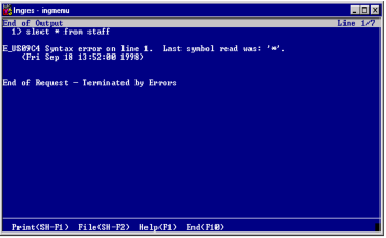 If the OnError setting is set to CONTINUE, the query continues after the error message appears. If set to TERMINATE, then the remaining portion of the query is terminated after the error message appears. Choose End to return to the input window and edit your erroneous entry, or clear the frame with the Blank operation and correctly retype your request.