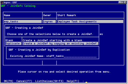 1. Choose JoinDefs from either the Ingres Menu or from the QBF Startup frame.
