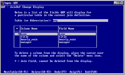 For example, suppose the Manager table is joined to the Staff table by joining the Manager.Manager column to the Staff.Name column. In this example, both tables have a column named Title that is not the join column. On the JoinDef Change Display frame for the Manager table, both Column Name and Field Name display title, but on the Change Display frame for the Staff table, Column Name shows title and Field Name shows title0.